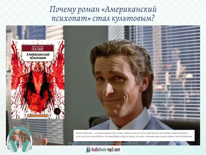 Аудиокнига онлайн «Американский психопат» — шокирующая книга, также это зеркало, в котором каждый может увидеть часть себя или своей эпохи. Его сцены вызывают отвращение, но в то же время поднимают важные вопросы.