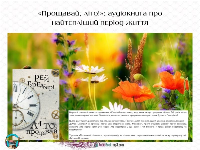 І по-третє — такі книги варто не лише читати, а й чути. Вони звучать у серці. Тож не зволікайте: слухайте аудіокнигу «Прощавай, літо!» онлайн безкоштовно — і нехай у вашому серці завжди буде місце для тепла, спогадів і трохи магії.